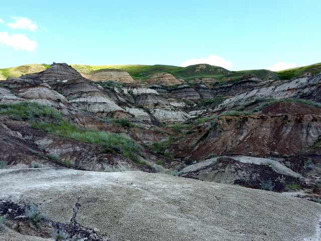 The 90 minute drive to Drumheller is a pleasant one, with a dramatic ending when the landscape changes suddenly as you enter the Badlands. The word "badlands'' originates from the french phrase les mauvaises terres or 'bad lands to traverse'. It's likely they were influenced by the Lakota people who moved to the area in the late 1700s and referred to the terrain as mako sica, meaning 'bad land'. No matter how you say it, it's like driving into another world, a very exciting one for both kids and adults alike!